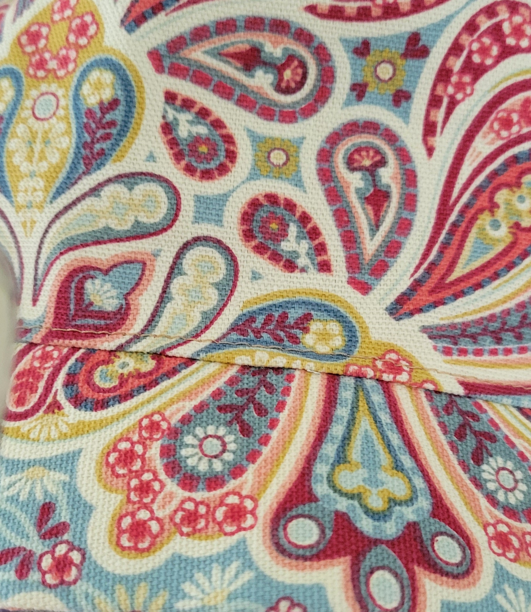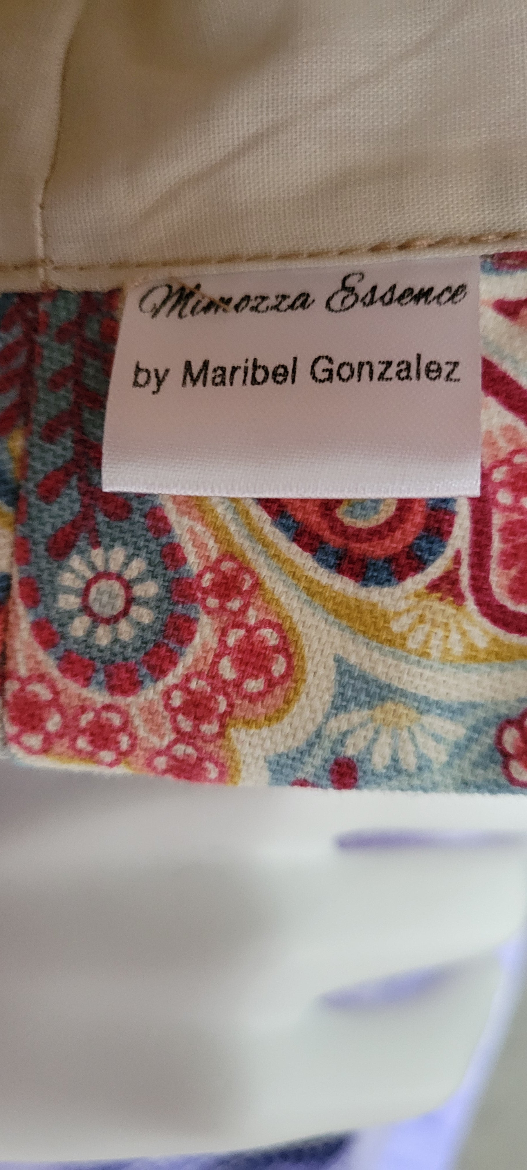 It is made of cotton canva fabric. Color: multicolor over cream base color.