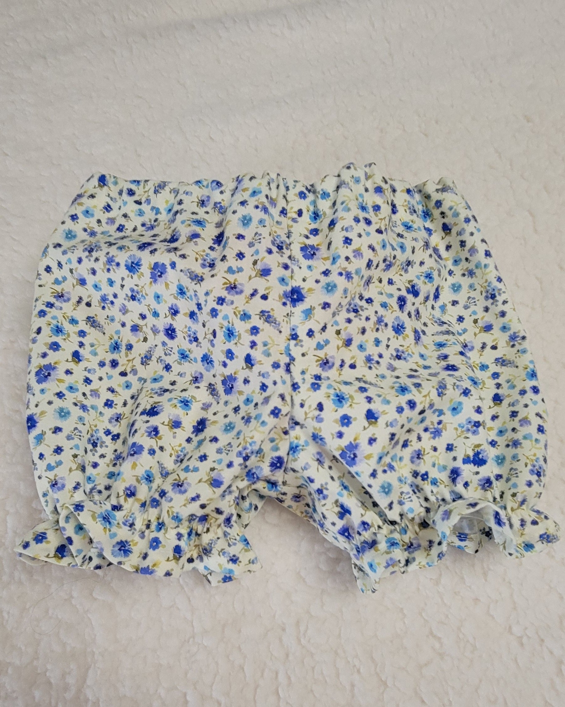 Delicate and timeless, this handmade baby girl dress features a soft floral print paired with light blue contrast fabric for a sweet, classic look. Made in the USA from 100% cotton, it’s designed with fluttery butterfly sleeves and includes matching bloomers for a coordinated finish.