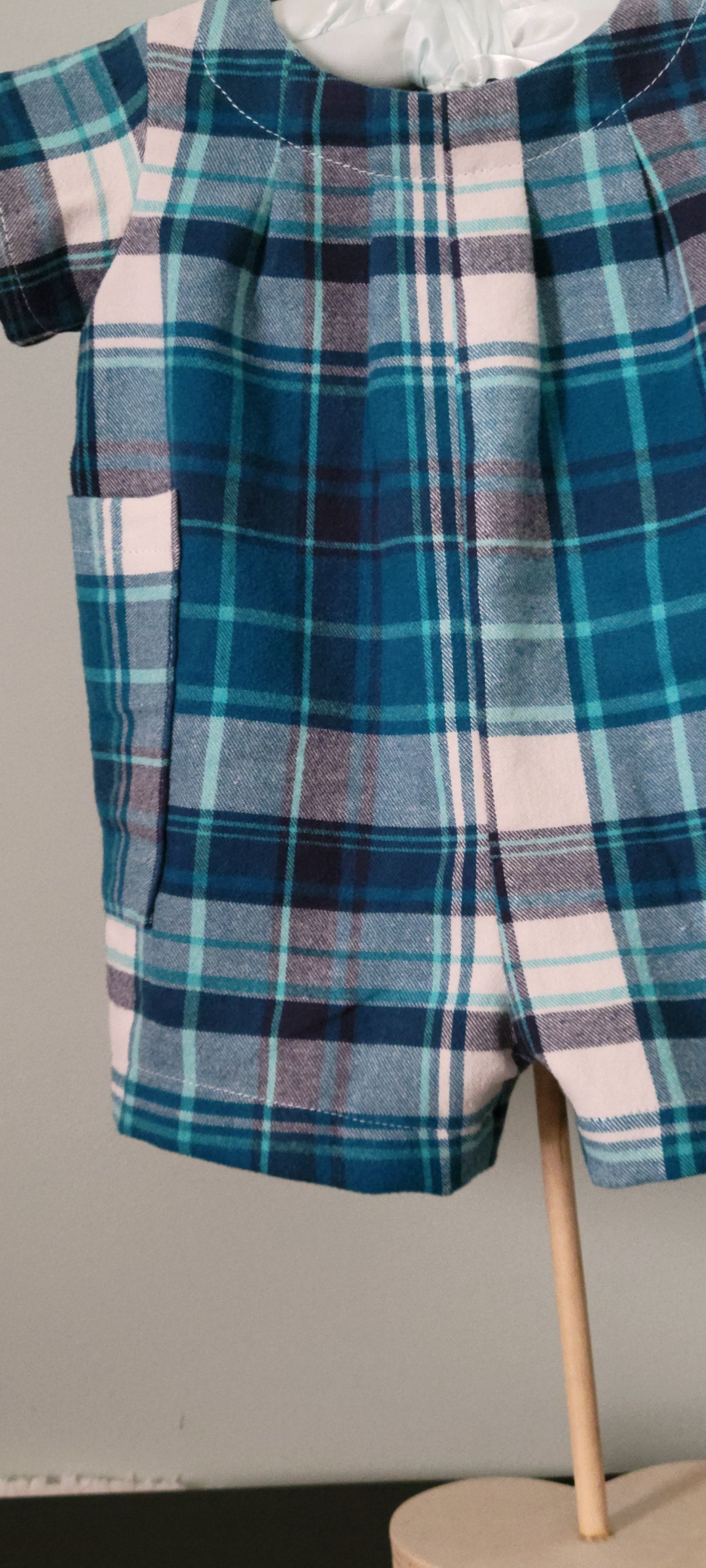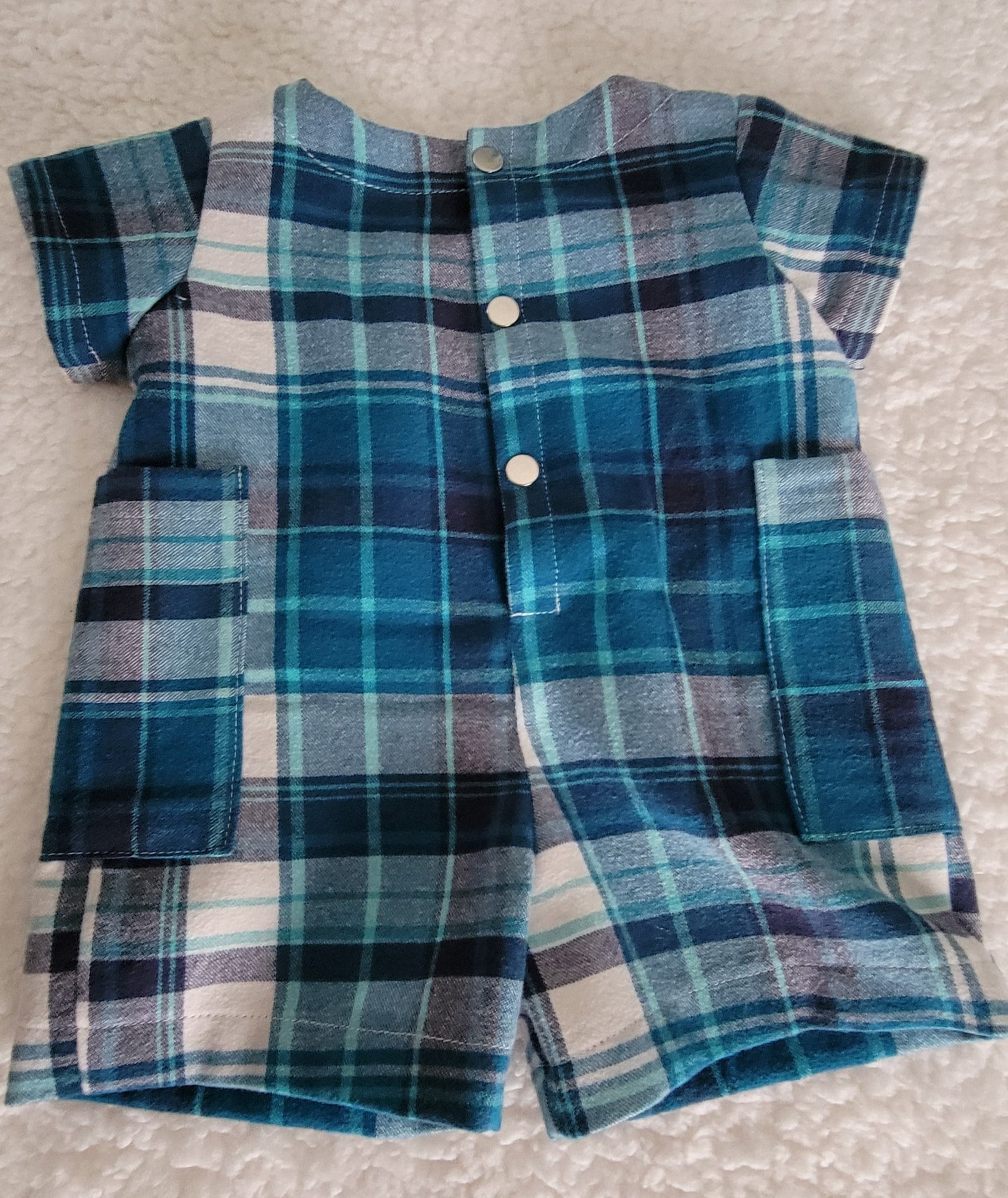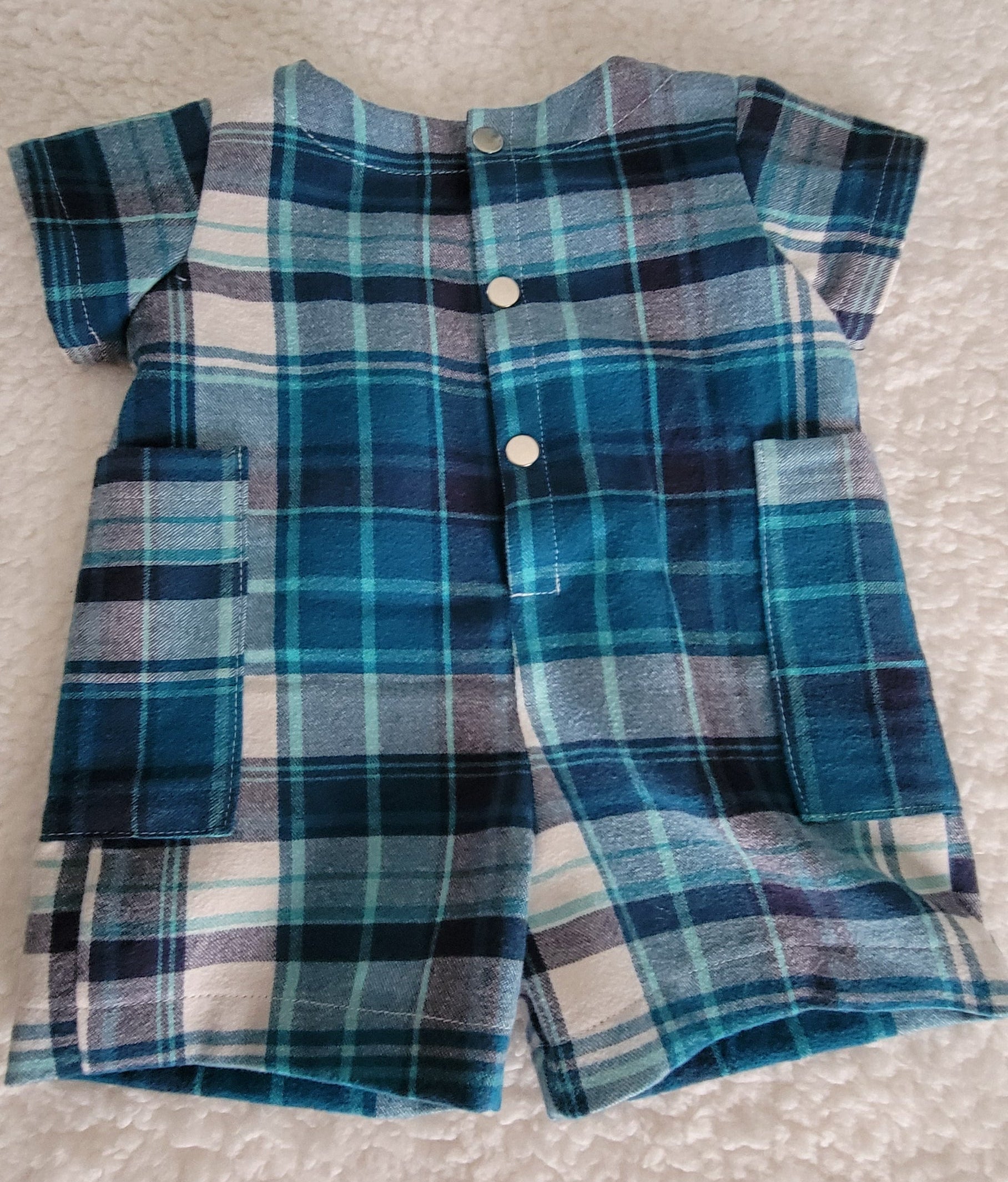 This charming baby boy romper features a classic blue-and-white plaid pattern, crafted from 100% soft cotton for all-day comfort. Designed with handy pockets on both sides and a secure metal snap closure at the back, it’s as practical as it is adorable.