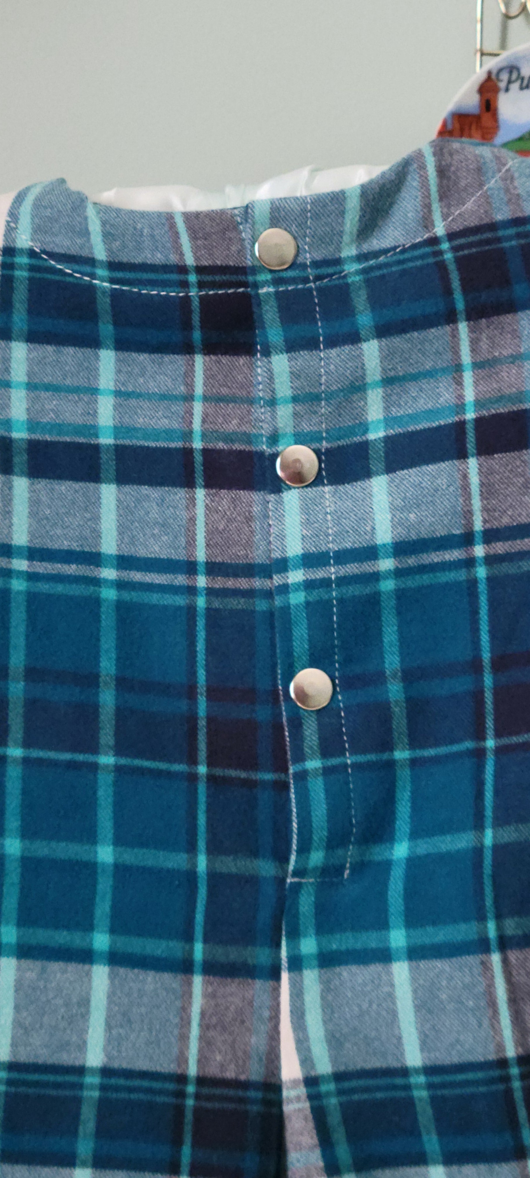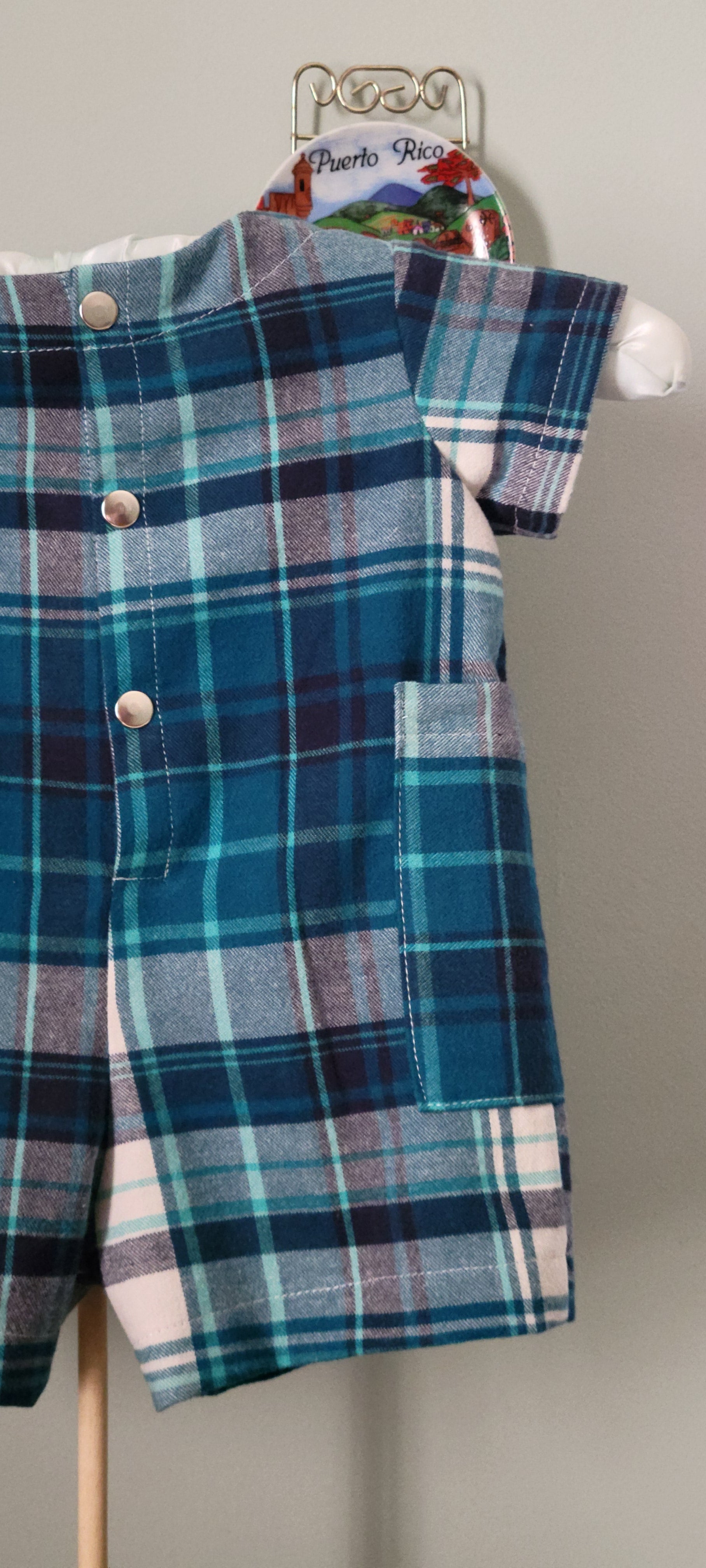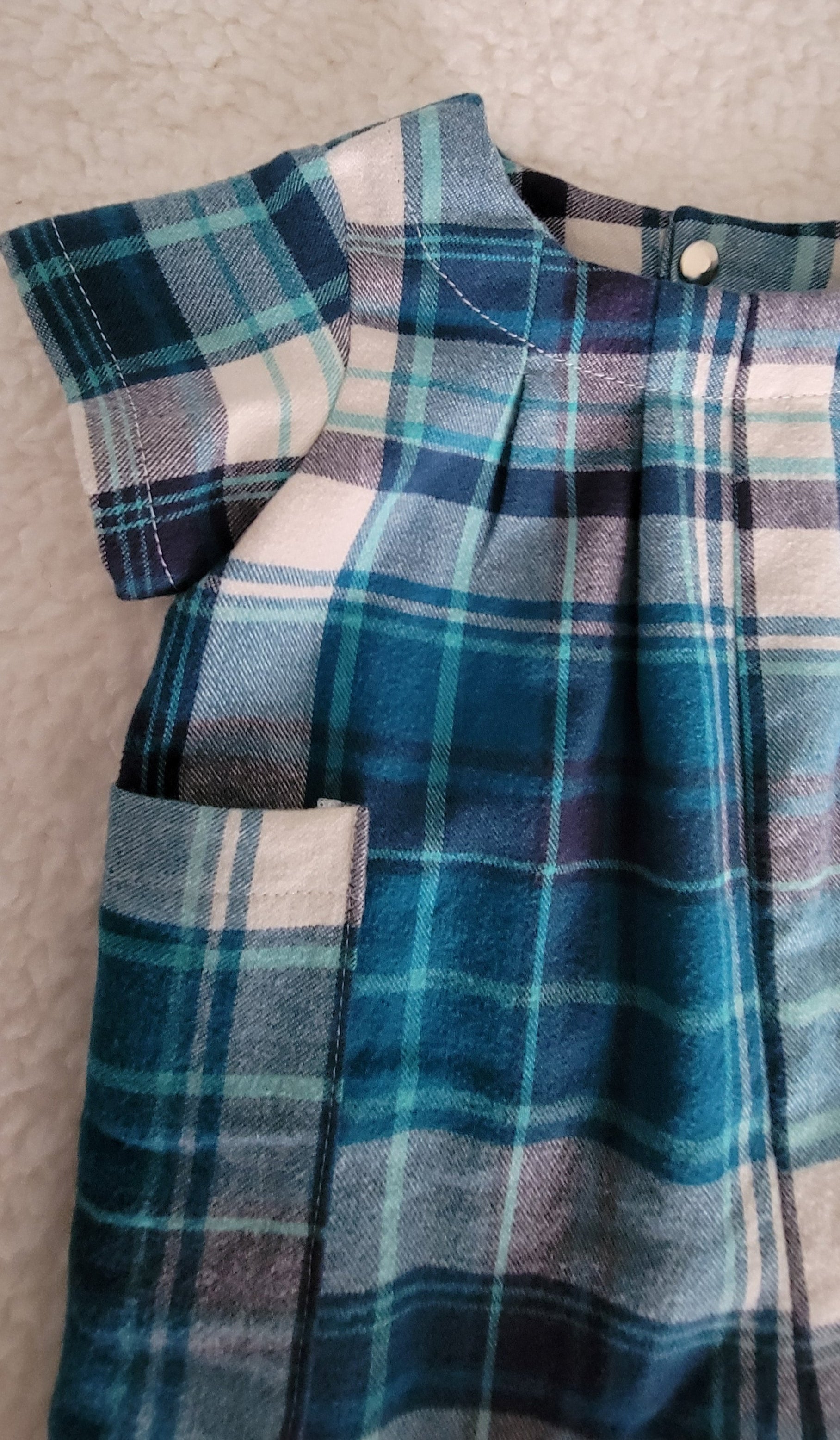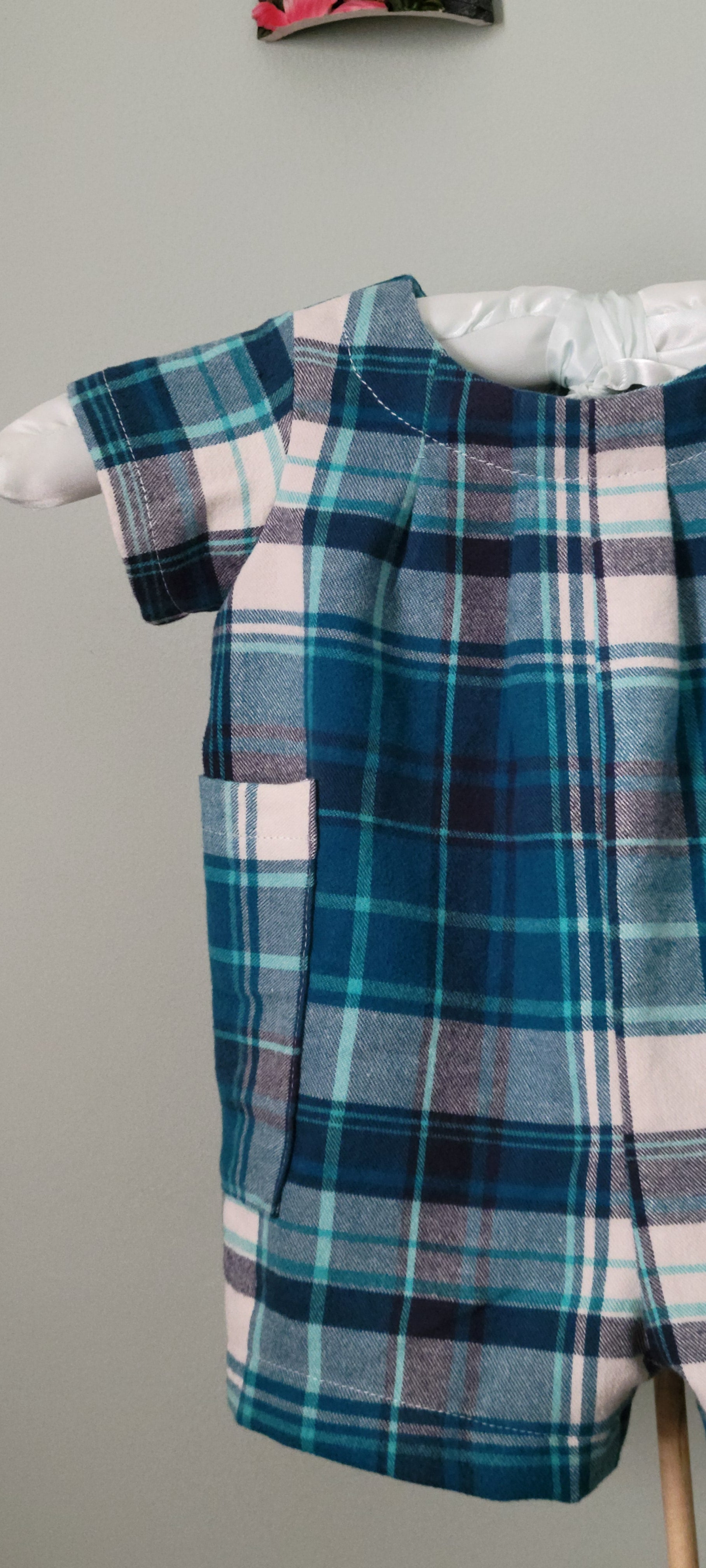 This charming baby boy romper features a classic blue-and-white plaid pattern, crafted from 100% soft cotton for all-day comfort. Designed with handy pockets on both sides and a secure metal snap closure at the back, it’s as practical as it is adorable.