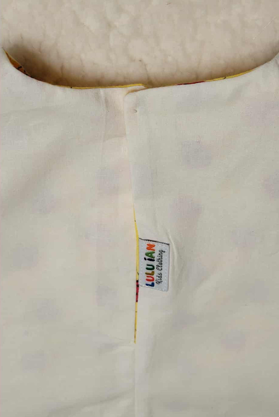 This handmade baby girl dress features a graceful pattern of lady bugs and white fowers on soft bright yellow cotton fabric. Designed for comfort this sleeveless dress is an A line style, completely lined. This dress brings elegance and sweetness together.
