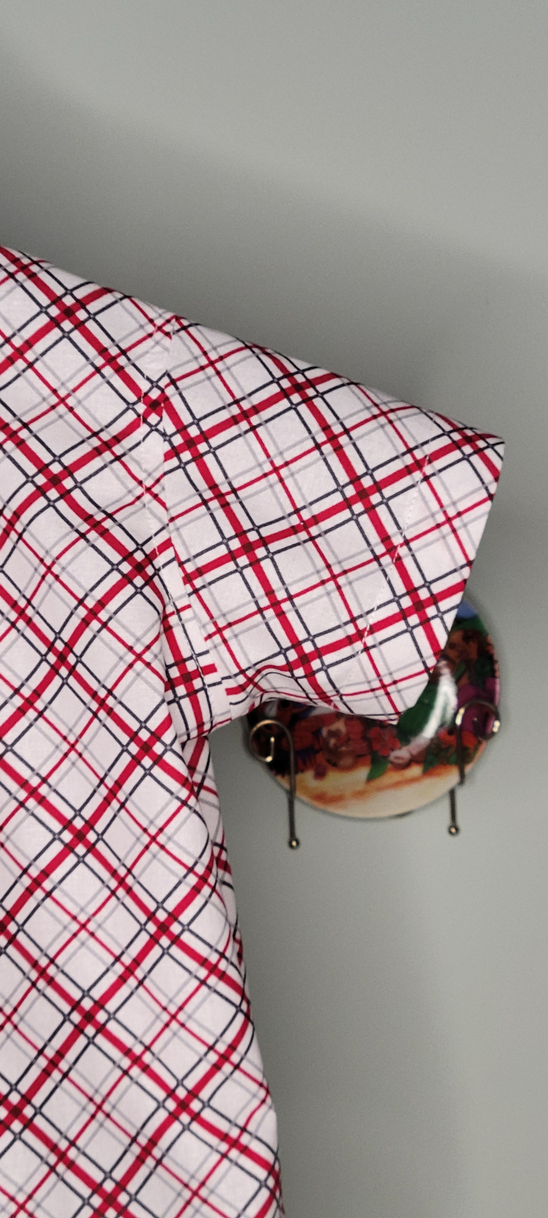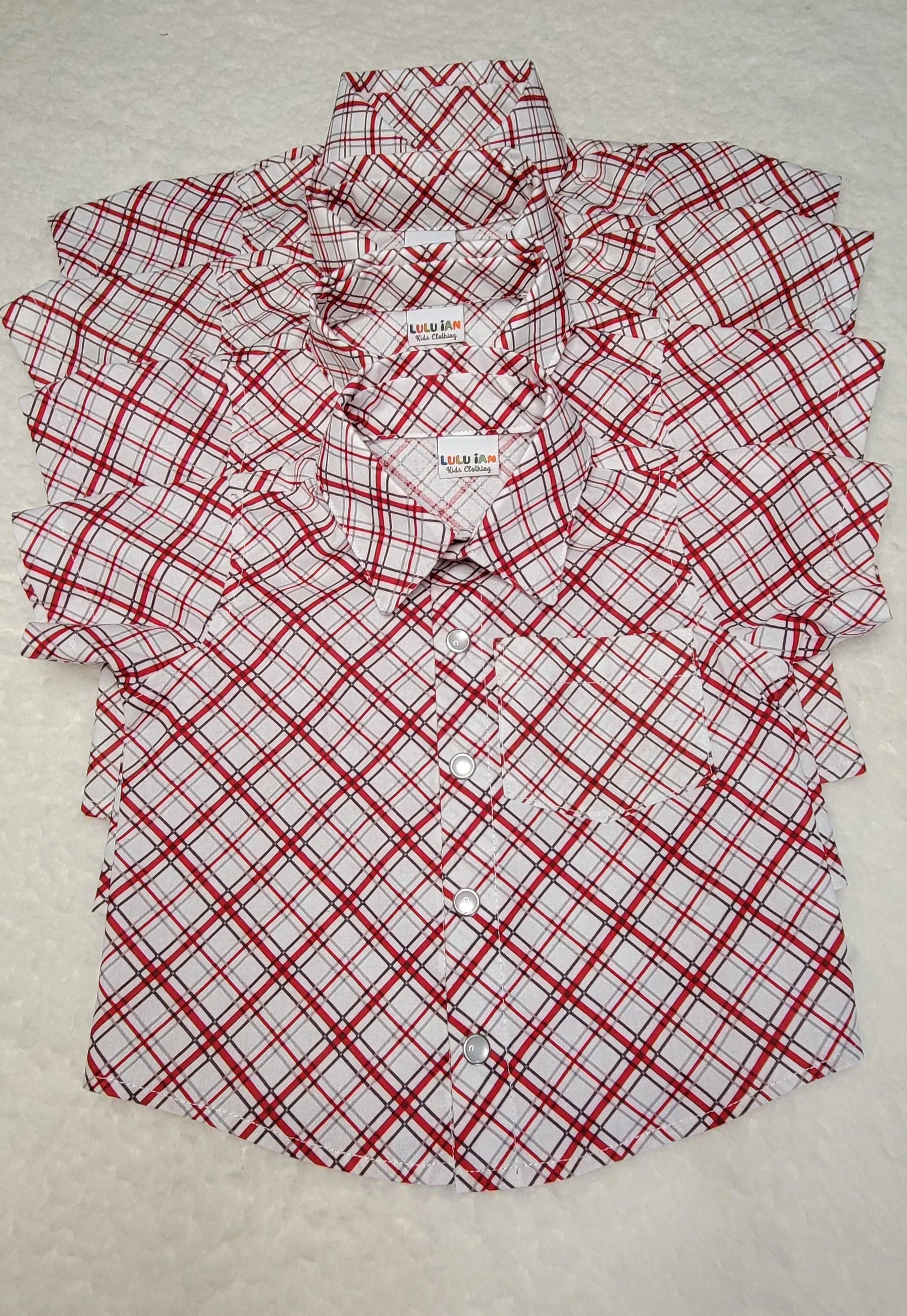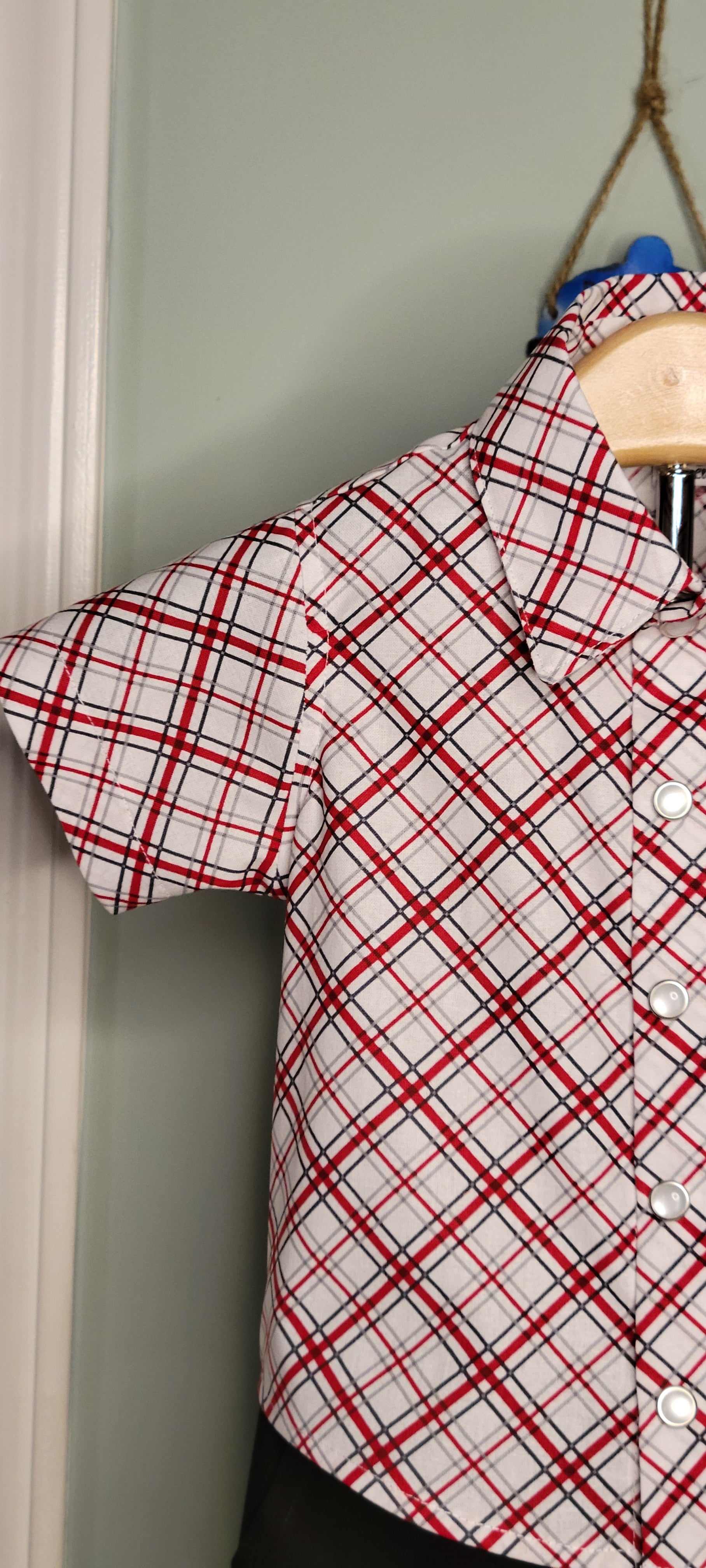 - Shirt: Crisp white with striking red, grey, and black plaid lines, featuring a convenient snap closure and a charming pocket on the left side.