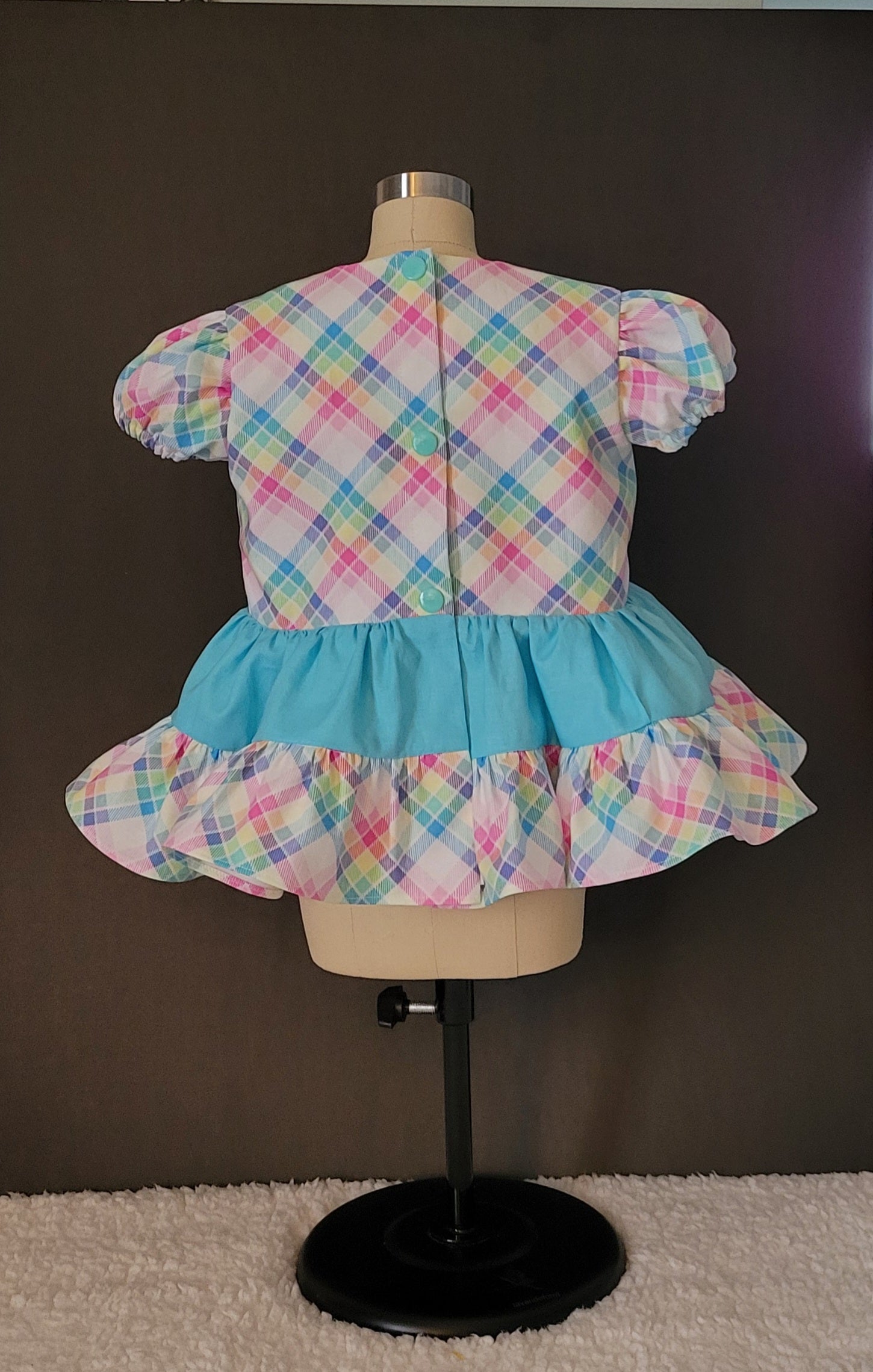 Adorable and timeless, this newborn dress features a ruffled skirt, puffy sleeves, and a sweet Peter Pan collar. Designed in a soft pastel check plaid with a light blue accent fabric, it’s fully lined for comfort and crafted from breathable cotton. The back closes with easy snaps for quick changes. Handmade in the USA with attention to every detail — perfect for special occasions or everyday charm.