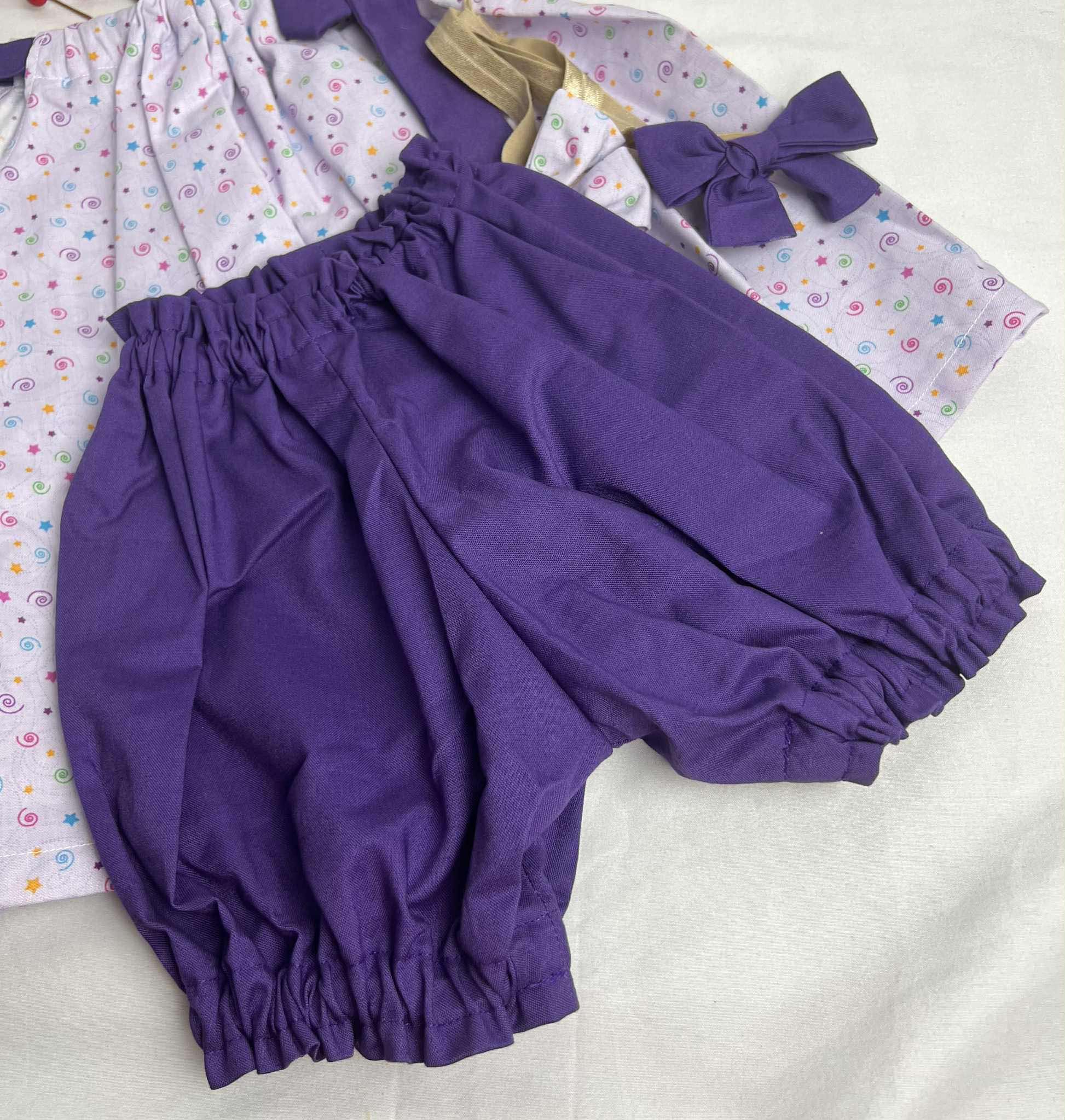 Sweet and playful, this handmade dress is crafted from 100% soft cotton. The side shoulder closure is tied with a coordinating ribbon for both adjustability and style. A matching bloomer completes the outfit for a perfectly coordinated look.